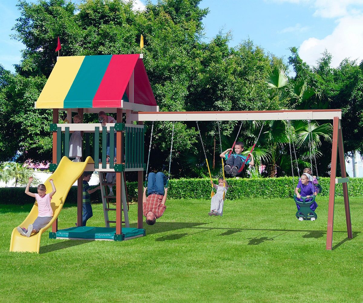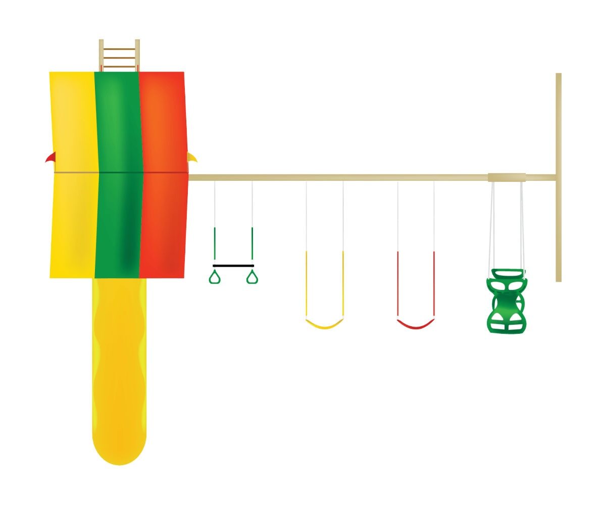 • Swings Included: Trapeze, sling swing (x2), horse glider