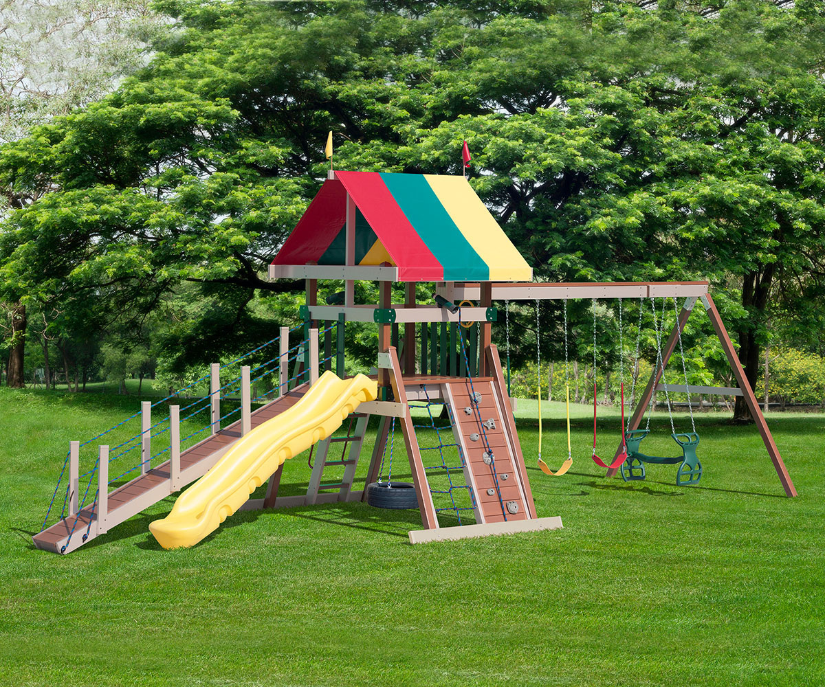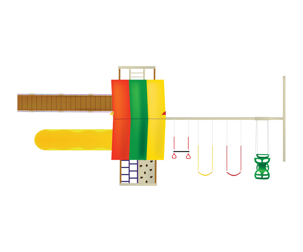 • Swings Included: Trapeze, sling swing (x2), horse glider
